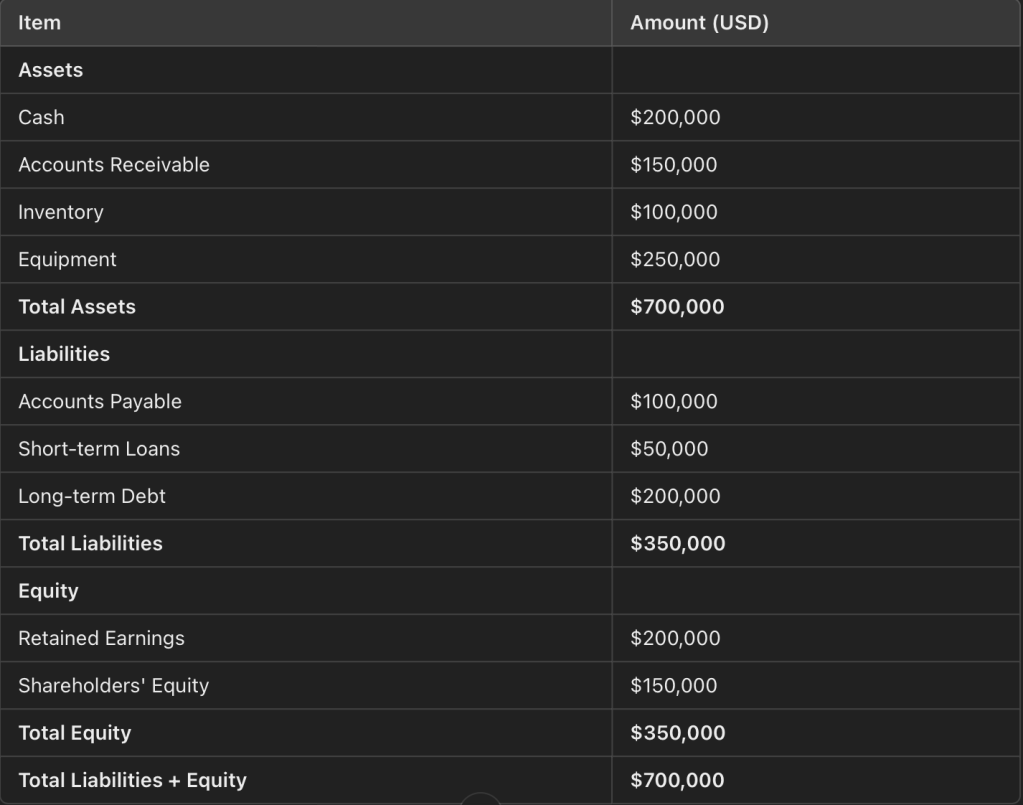 - Debt-to-Equity Ratio: Assesses whether the company’s debt is excessive compared to its equity, calculated as (Liabilities ÷ Equity).