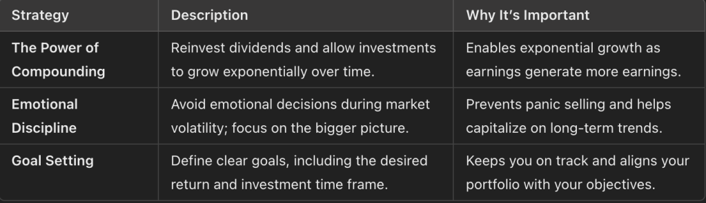 - The Power of Compounding: Reinvest dividends and capitalize on stock price appreciation over the long term to maximize compounding effects.