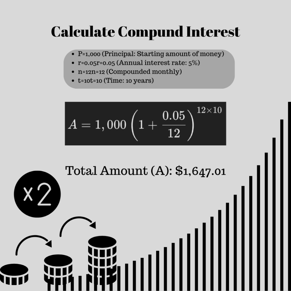 Using these values in the compound interest formula, we see how the initial $1,000 grows over time. Each month, the interest adds a little more to the balance, and as this happens repeatedly over 10 years, your money compounds into a total of $1,647.01.
