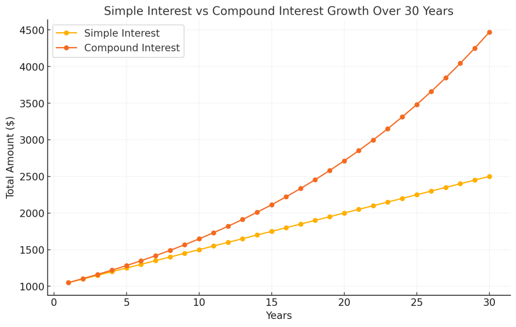 Now, let’s compare simple interest and compound interest over a 30-year period.