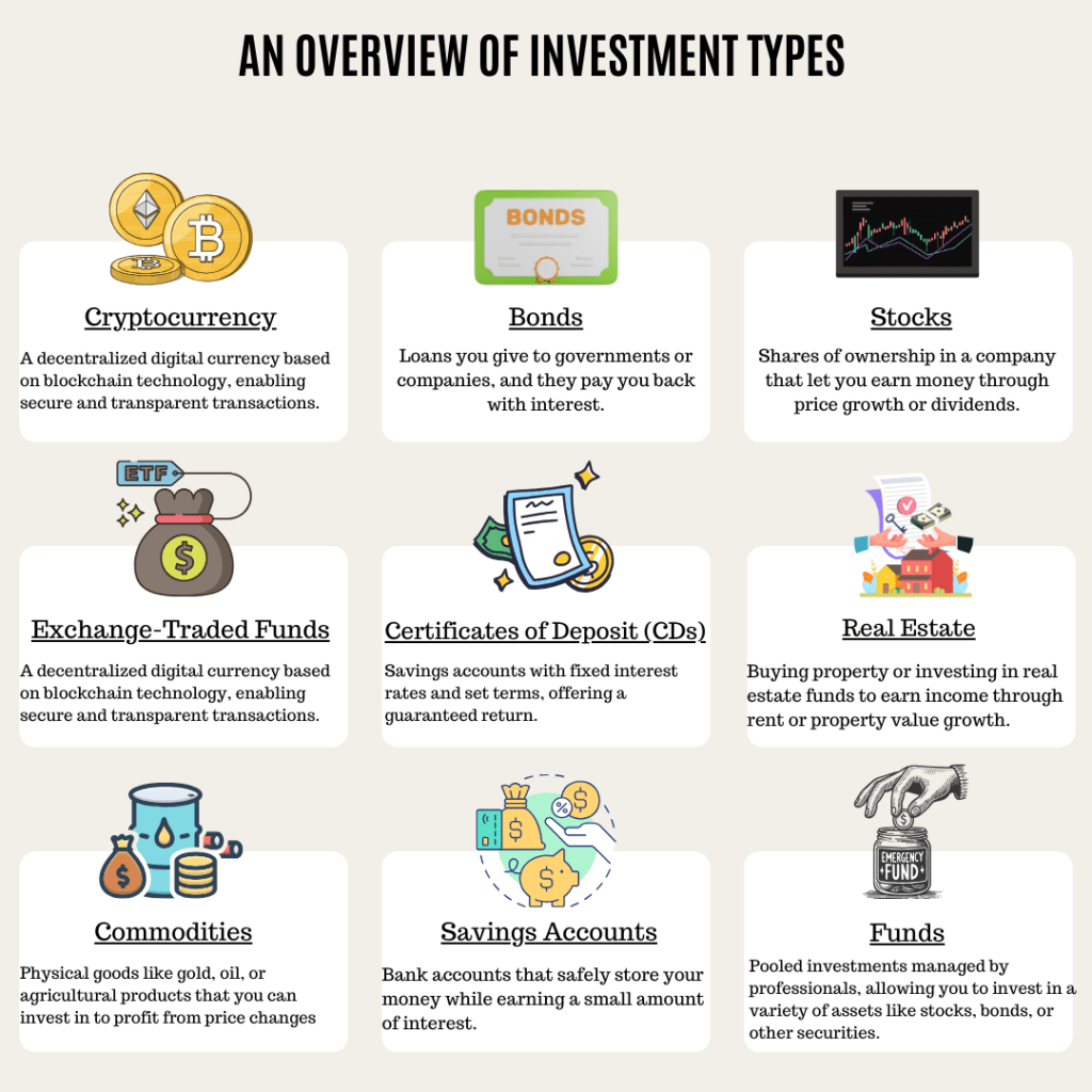 From traditional choices like stocks, bonds, and real estate to modern innovations like cryptocurrency and exchange-traded funds, each type of investment offers unique benefits and risks. Understanding these options is key to making informed decisions that align with your financial goals. In this post, we’ll provide a clear and concise overview of the major types of investments, helping you navigate the world of investing with confidence and purpose.